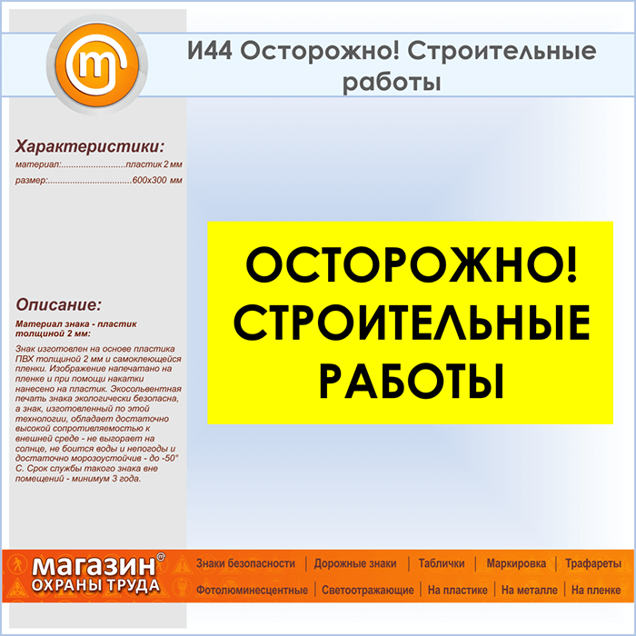 Знак «Осторожно! Строительные работы», И44 (пластик, 600х300 мм) в Кызыле купить