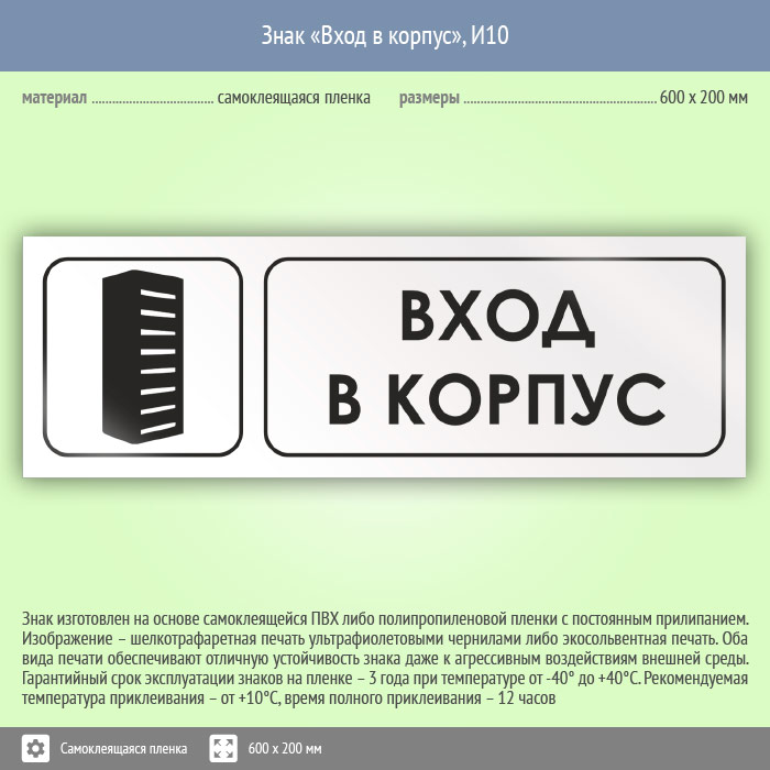 Знак «Вход в корпус», И10 (пленка, 600х200 мм) в Кызыле купить