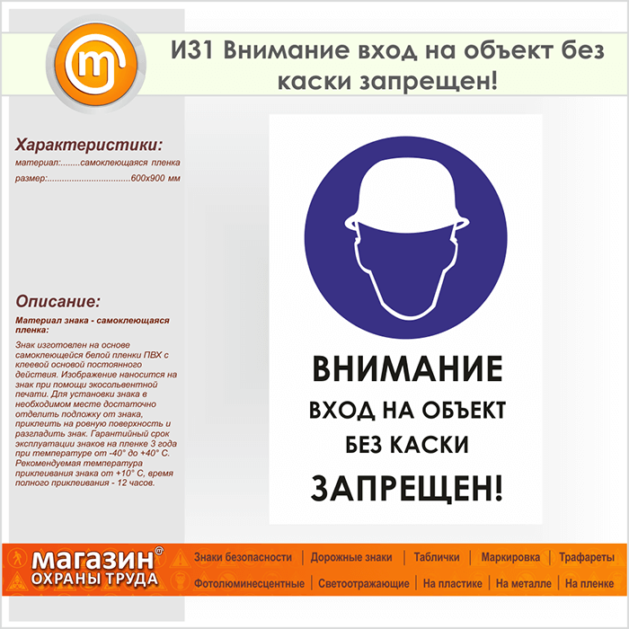 Знак «Внимание вход на объект без каски запрещен!», И31 (пленка, 600х900 мм) в Кызыле купить