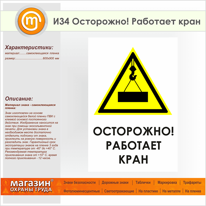 Знак «Осторожно! Работает кран», И34 (пленка, 600х900 мм) в Кызыле купить