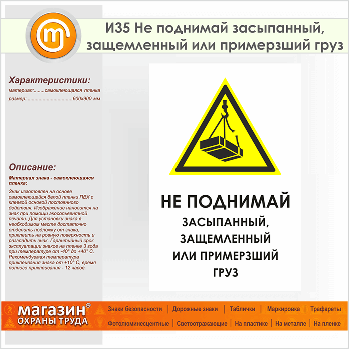 Знак «Не поднимай засыпанный, защемленный или примерзший груз», И35 (пленка, 600х900 мм) в Кызыле купить