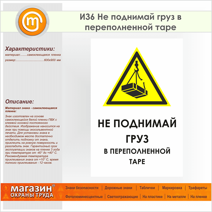 Знак «Не поднимай груз в переполненной таре», И36 (пленка, 600х900 мм) в Кызыле купить