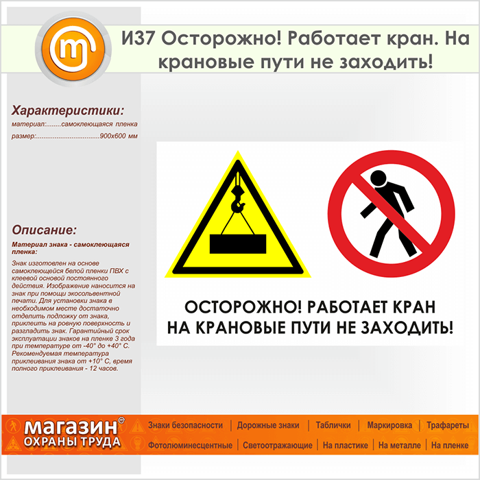 Знак «Осторожно! Работает кран. На крановые пути не заходить!», И37 (пленка, 900х600 мм) в Кызыле купить