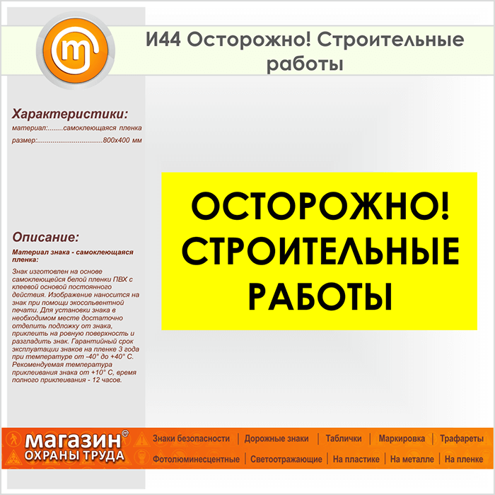 Знак «Осторожно! Строительные работы», И44 (пленка, 800х400 мм) в Кызыле купить