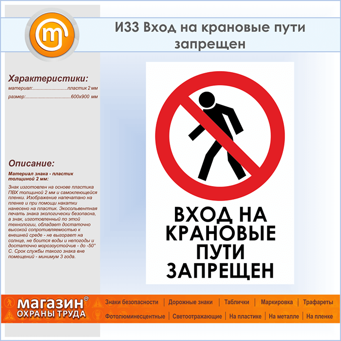 Знак «Вход на крановые пути запрещен», И33 (пластик, 600х900 мм) в Кызыле купить
