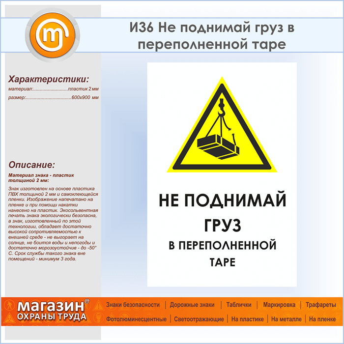 Знак «Не поднимай груз в переполненной таре», И36 (пластик, 600х900 мм) в Кызыле купить