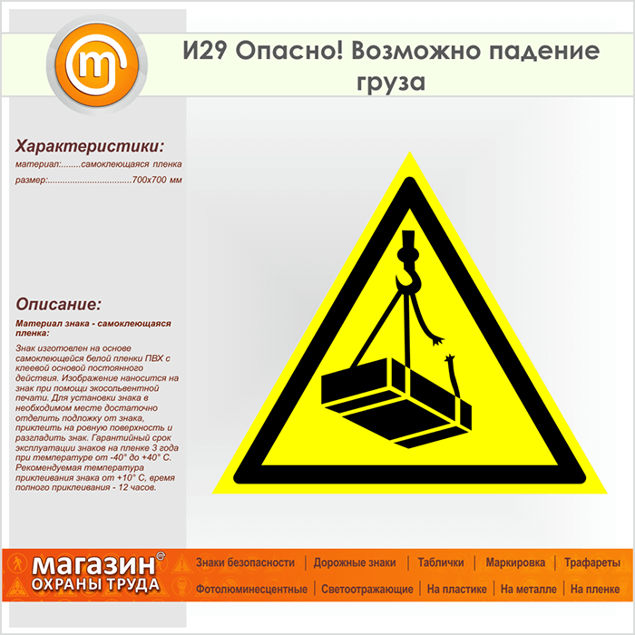Знак «Опасно! Возможно падение груза», И29 (пленка, сторона 700 мм) в Кызыле купить