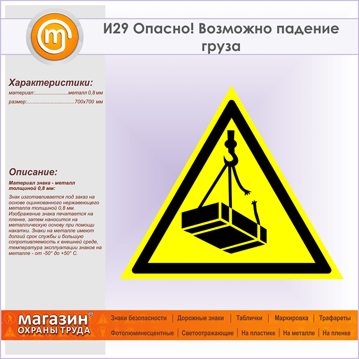 Знак «Опасно! Возможно падение груза», И29 (металл, сторона 700 мм) в Кызыле купить