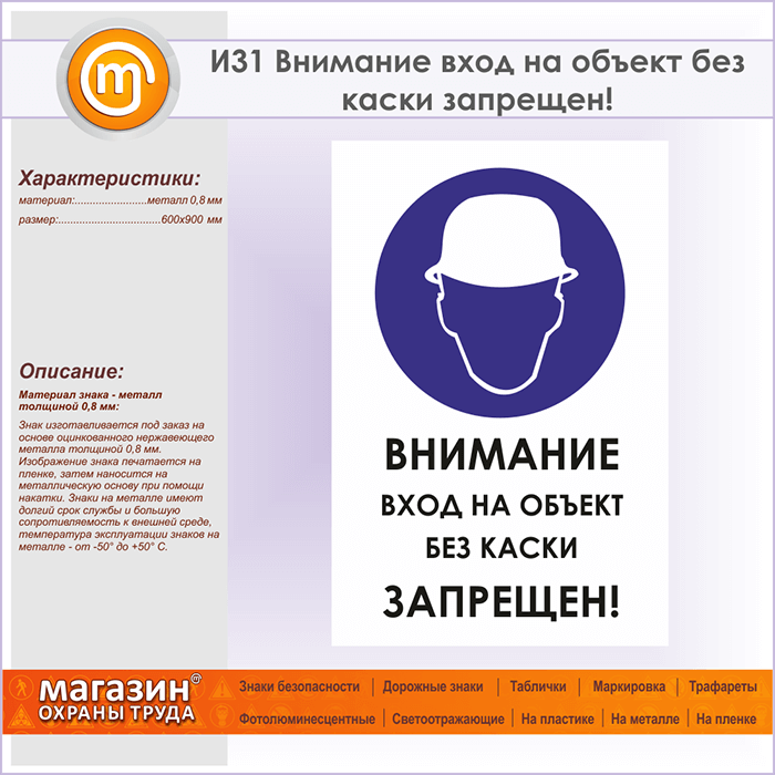 Знак «Внимание вход на объект без каски запрещен!», И31 (металл, 600х900 мм) в Кызыле купить