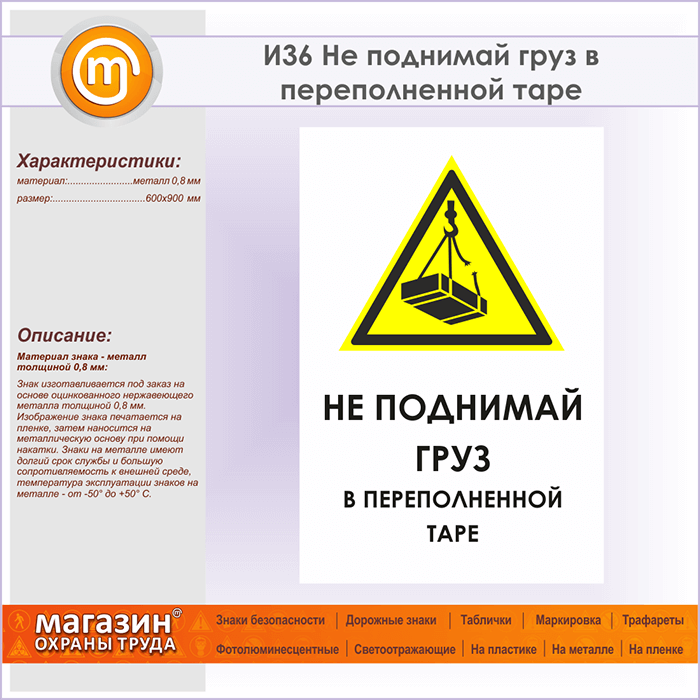 Знак «Не поднимай груз в переполненной таре», И36 (металл, 600х900 мм) в Кызыле купить