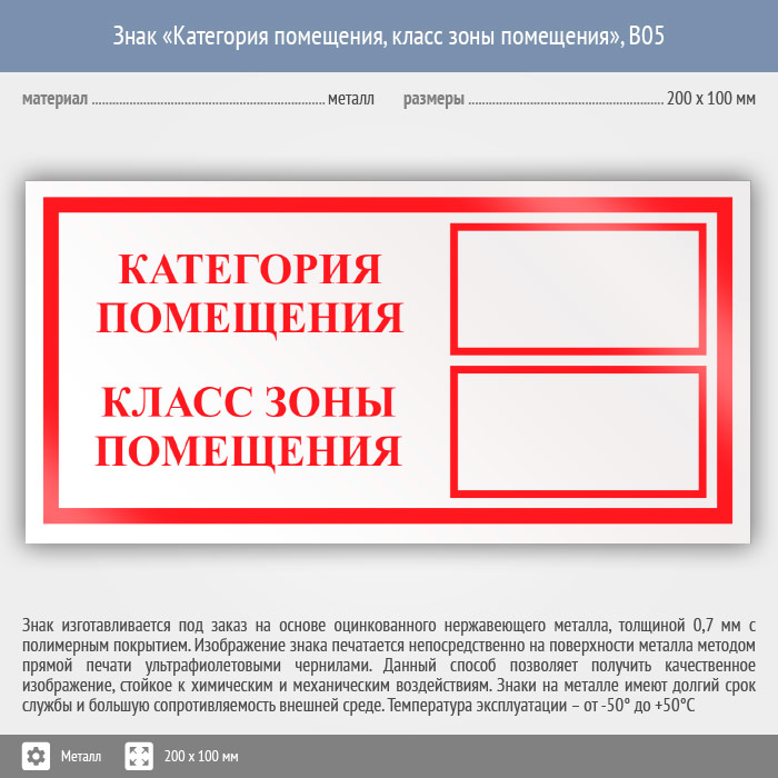 Знак «Категория помещения, класс зоны помещения», B05 (металл, 200х100 мм) в Кызыле купить