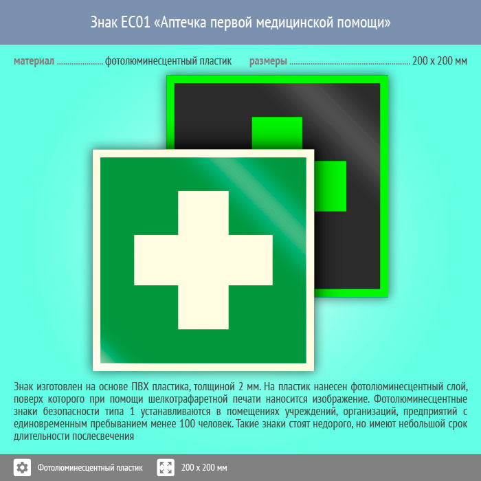 Знак EC01 «Аптечка первой медицинской помощи» (фотолюминесцентный пластик, 200х200 мм) в Кызыле купить