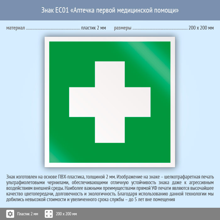 Знак EC01 «Аптечка первой медицинской помощи» (пластик, 200х200 мм) в Кызыле купить