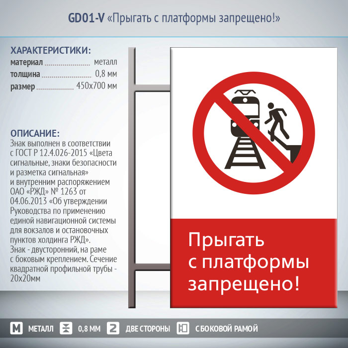 Знак «Прыгать с платформы запрещено!», GD01-V (двусторонний вертикальный, 450х700 мм, металл, на раме с боковым креплением) в Кызыле купить
