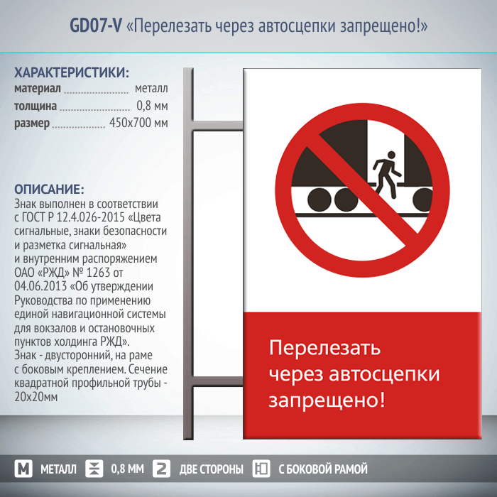 Знак «Перелезать через автосцепки запрещено!», GD07-V (двусторонний вертикальный, 450х700 мм, металл, на раме с боковым креплением) в Кызыле купить