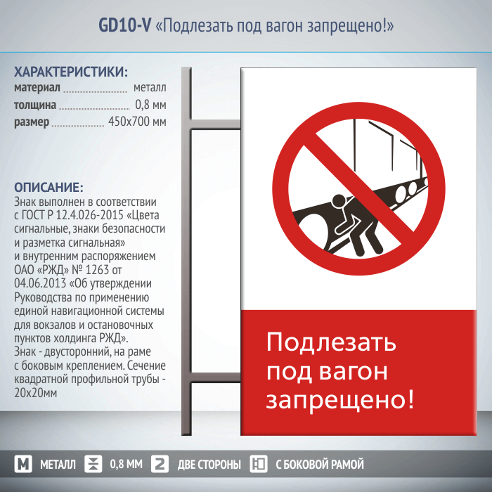 Знак «Подлезать под вагон запрещено!», GD10-V (двусторонний вертикальный, 450х700 мм, металл, на раме с боковым креплением) в Кызыле купить