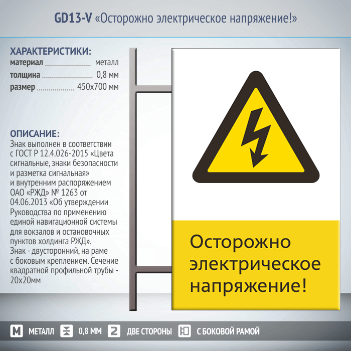 Знак «Осторожно электрическое напряжение!», GD13-V (двусторонний вертикальный, 450х700 мм, металл, на раме с боковым креплением) в Кызыле купить