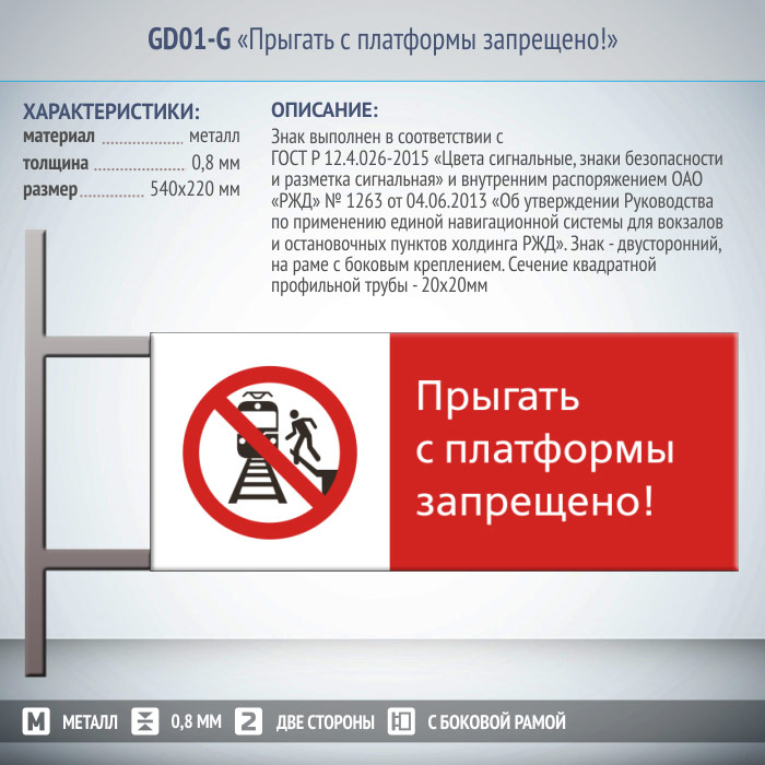 Знак «Прыгать с платформы запрещено!», GD01-G (двусторонний горизонтальный, 540х220 мм, металл, на раме с боковым креплением) в Кызыле купить