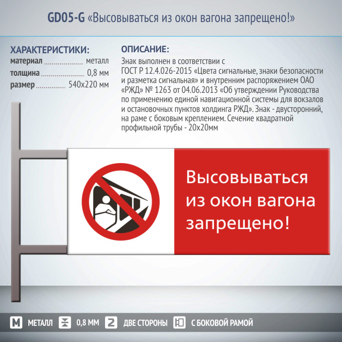 Знак «Высовываться из окон вагона запрещено!», GD05-G (двусторонний горизонтальный, 540х220 мм, металл, на раме с боковым креплением) в Кызыле купить