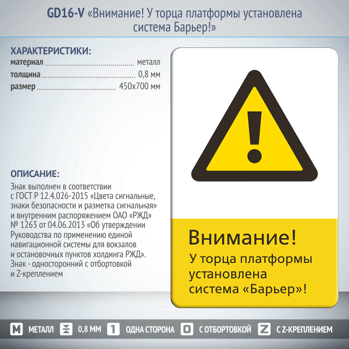 Знак «Внимание! У торца платформы установлена система Барьер!», GD16-V (односторонний вертикальный, 450х700 мм, металл, с отбортовкой и Z-креплением) в Кызыле купить