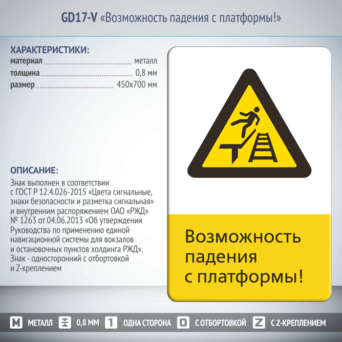 Знак «Возможность падения с платформы!», GD17-V (односторонний вертикальный, 450х700 мм, металл, с отбортовкой и Z-креплением) в Кызыле купить