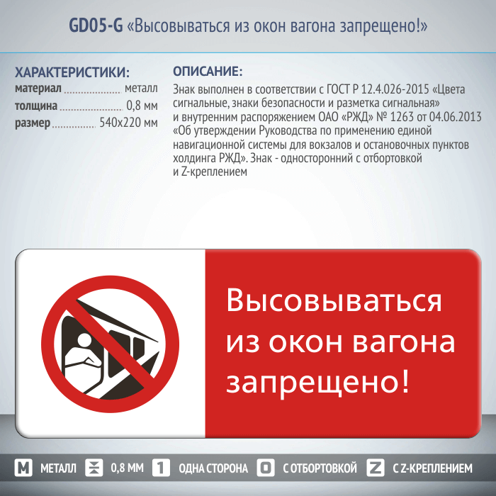 Знак «Высовываться из окон вагона запрещено!», GD05-G (односторонний горизонтальный, 540х220 мм, металл, с отбортовкой и Z-креплением) в Кызыле купить