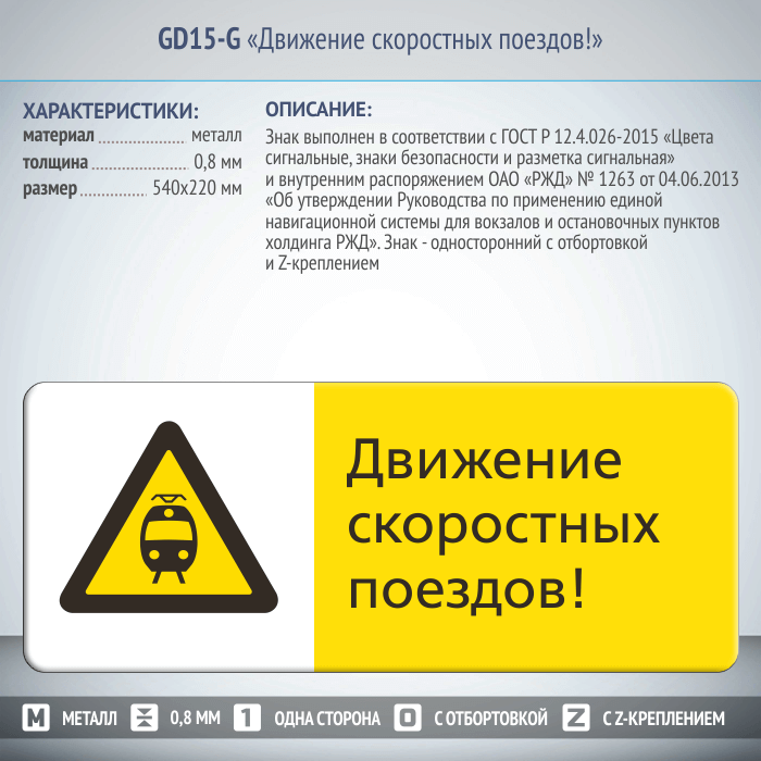 Знак «Движение скоростных поездов!», GD15-G (односторонний горизонтальный, 540х220 мм, металл, с отбортовкой и Z-креплением) в Кызыле купить