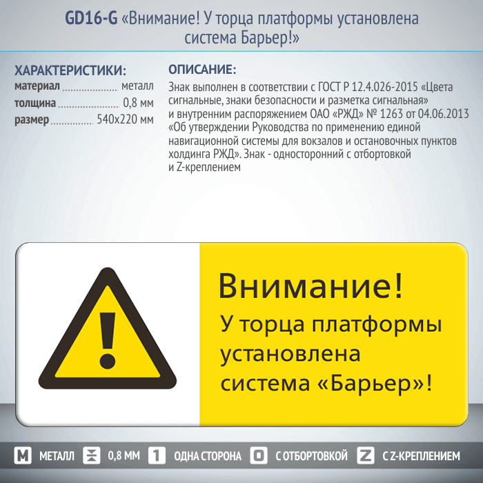 Знак «Внимание! У торца платформы установлена система Барьер!», GD16-G (односторонний горизонтальный, 540х220 мм, металл, с отбортовкой и Z-креплением) в Кызыле купить