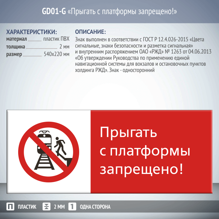 Знак «Прыгать с платформы запрещено!», GD01-G (односторонний горизонтальный, 540х220 мм, пластик 2 мм) в Кызыле купить