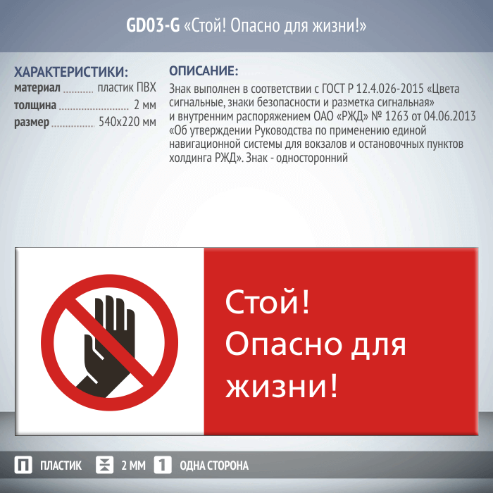 Знак «Стой! Опасно для жизни!», GD03-G (односторонний горизонтальный, 540х220 мм, пластик 2 мм) в Кызыле купить