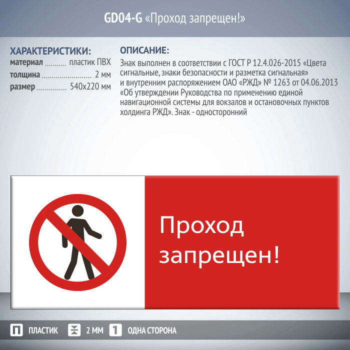Знак «Проход запрещен!», GD04-G (односторонний горизонтальный, 540х220 мм, пластик 2 мм) в Кызыле купить