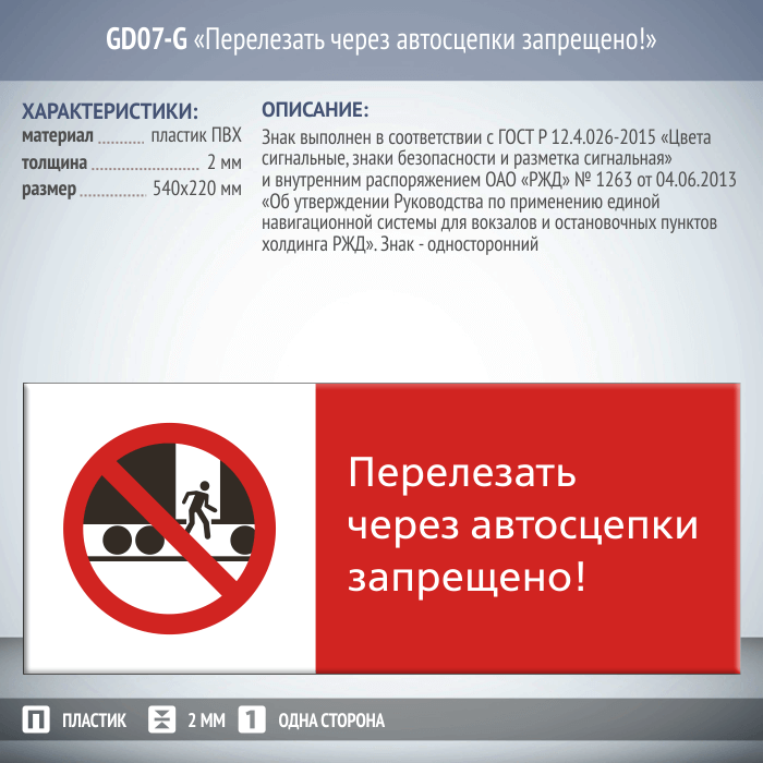 Знак «Перелезать через автосцепки запрещено!», GD07-G (односторонний горизонтальный, 540х220 мм, пластик 2 мм) в Кызыле купить