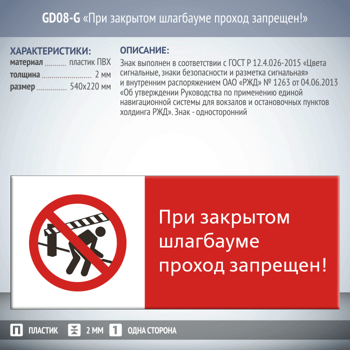 Знак «При закрытом шлагбауме проход запрещен!», GD08-G (односторонний горизонтальный, 540х220 мм, пластик 2 мм) в Кызыле купить