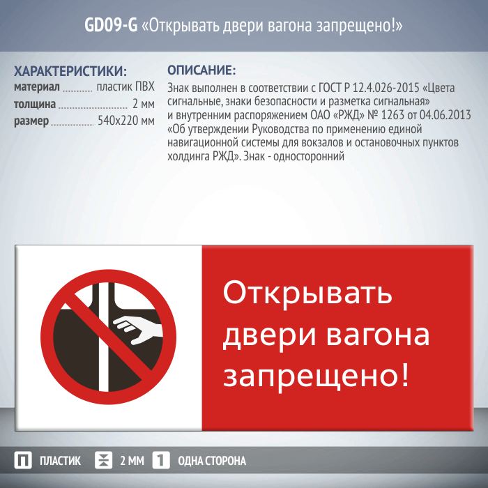 Знак «Открывать двери вагона запрещено!», GD09-G (односторонний горизонтальный, 540х220 мм, пластик 2 мм) в Кызыле купить