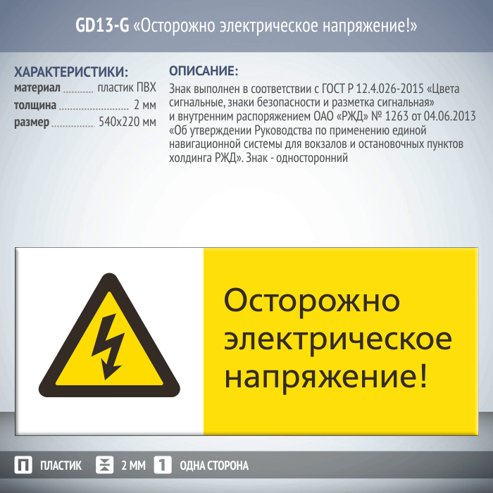 Знак «Осторожно электрическое напряжение!», GD13-G (односторонний горизонтальный, 540х220 мм, пластик 2 мм) в Кызыле купить