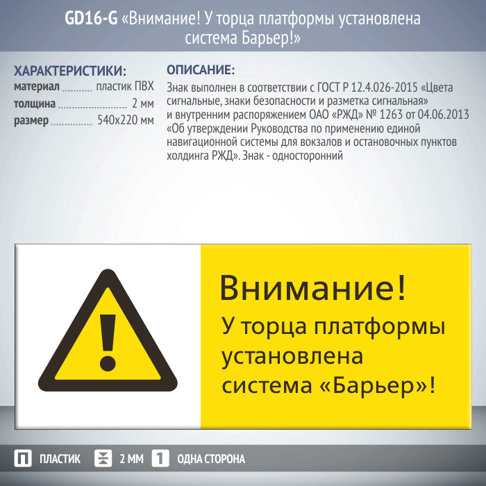 Знак «Внимание! У торца платформы установлена система Барьер!», GD16-G (односторонний горизонтальный, 540х220 мм, пластик 2 мм) в Кызыле купить