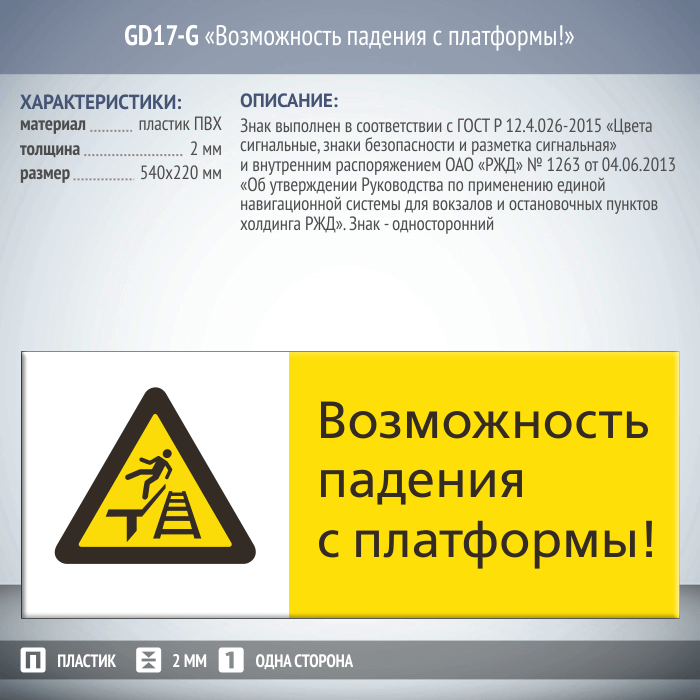 Знак «Возможность падения с платформы!», GD17-G (односторонний горизонтальный, 540х220 мм, пластик 2 мм) в Кызыле купить