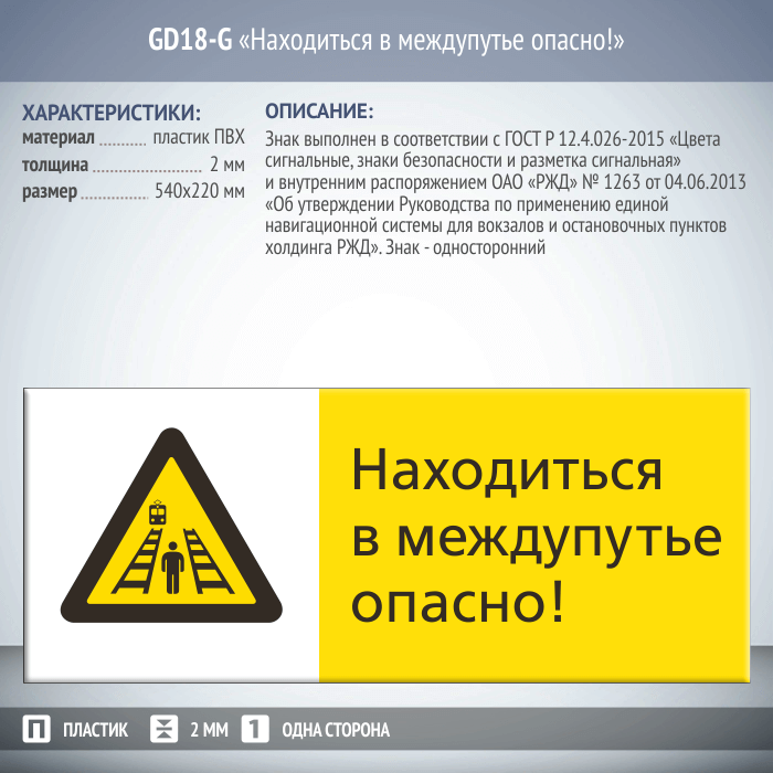 Знак «Находиться в междупутье опасно!», GD18-G (односторонний горизонтальный, 540х220 мм, пластик 2 мм) в Кызыле купить