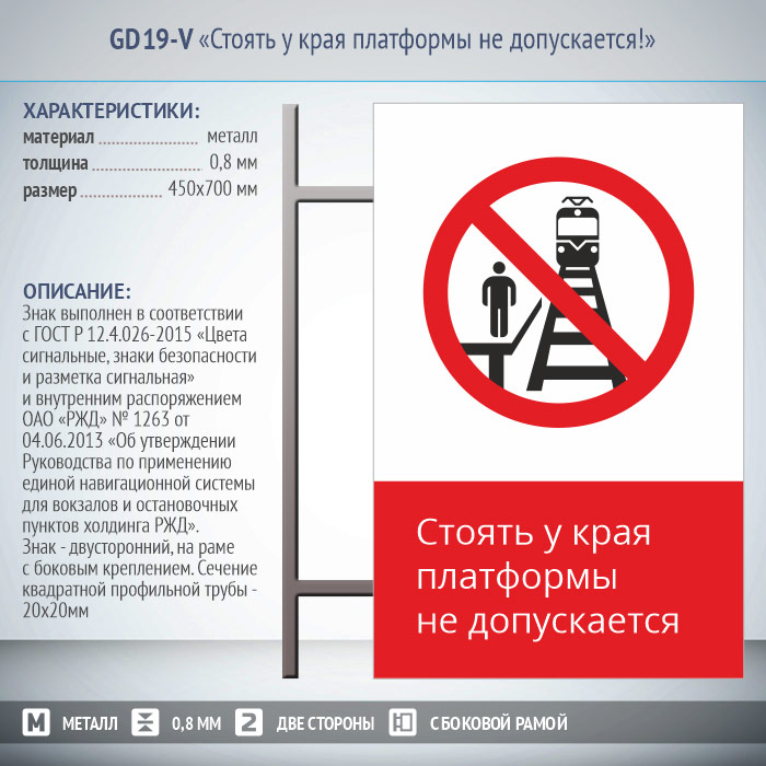 Знак «Стоять у края платформы не допускается!», GD19-V (двусторонний вертикальный, 450х700 мм, металл, на раме с боковым креплением) в Кызыле купить