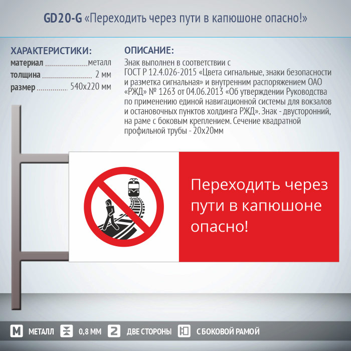 Знак «Переходить через пути в капюшоне опасно!», GD20-G (двусторонний горизонтальный, 540х220 мм, металл, на раме с боковым креплением) в Кызыле купить