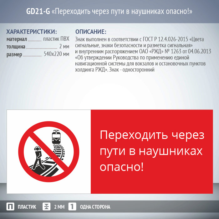 Знак «Переходить через пути в наушниках опасно!», GD21-G (односторонний горизонтальный, 540х220 мм, пластик 2 мм) в Кызыле купить