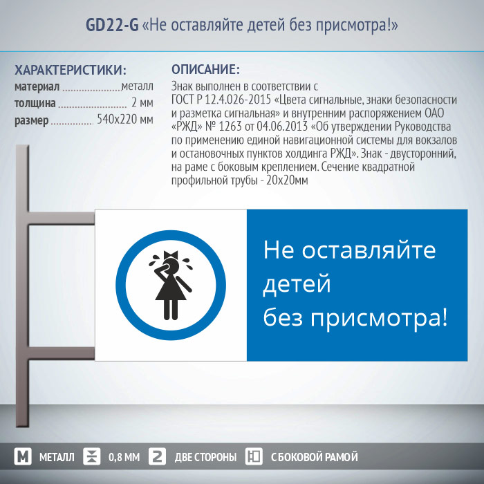 Знак «Не оставляйте детей без присмотра!», GD22-G (двусторонний горизонтальный, 540х220 мм, металл, на раме с боковым креплением) в Кызыле купить