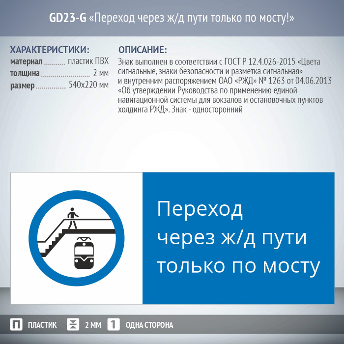 Знак «Переход через ж/д пути только по мосту!», GD23-G (односторонний горизонтальный, 540х220 мм, пластик 2 мм) в Кызыле купить