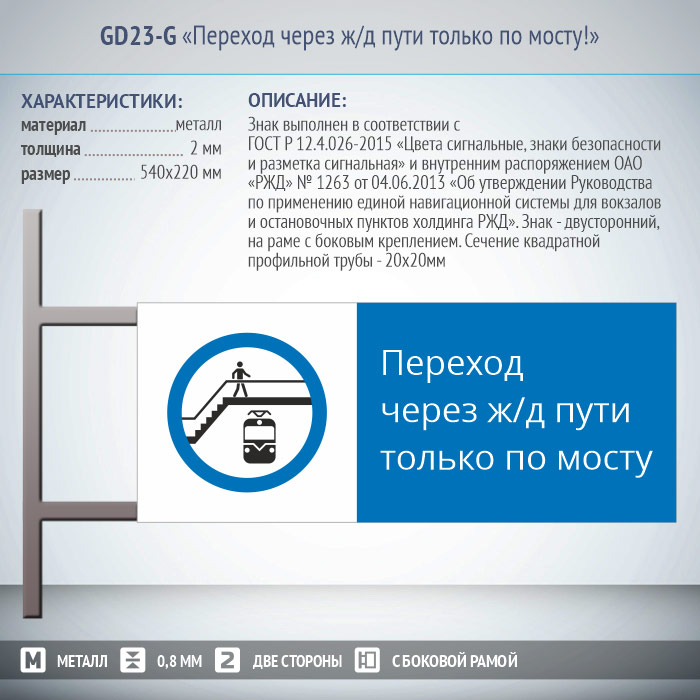 Знак «Переход через ж/д пути только по мосту!», GD23-G (двусторонний горизонтальный, 540х220 мм, металл, на раме с боковым креплением) в Кызыле купить
