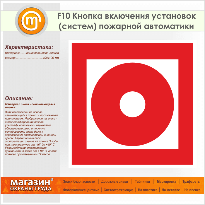 Знак F10 «Кнопка включения установок (систем) пожарной автоматики» (пленка, 100х100 мм) в Кызыле купить