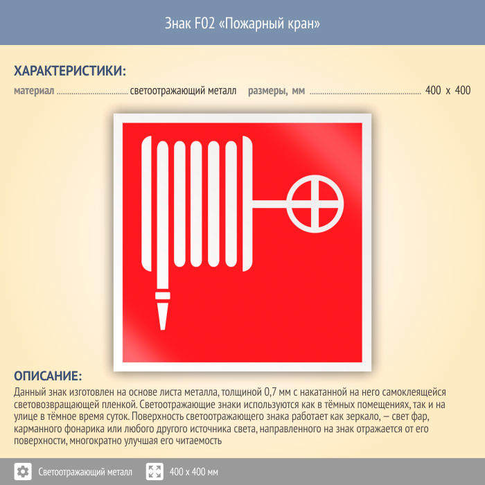 Знак F02 «Пожарный кран» (светоотражающий металл, 400х400 мм) в Кызыле купить