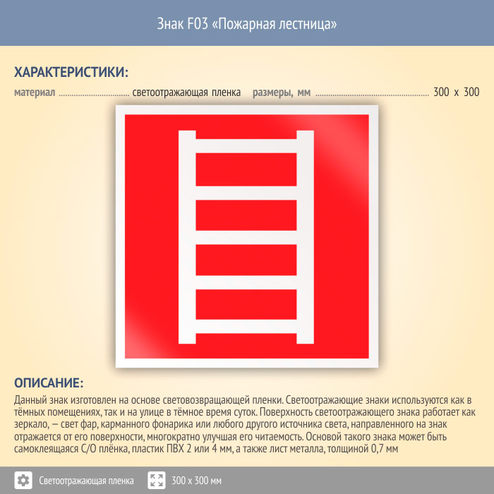 Знак F03 «Пожарная лестница» (светоотражающая пленка, 300х300 мм) в Кызыле купить