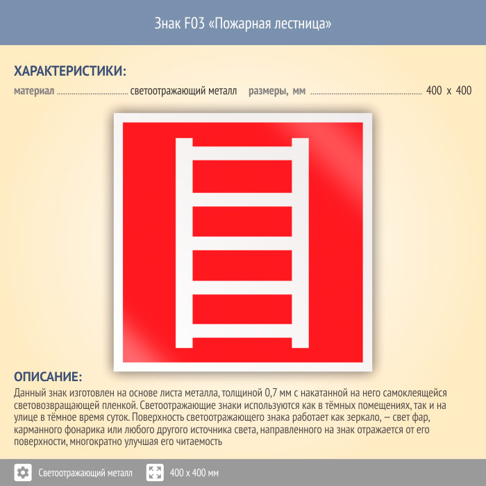 Знак F03 «Пожарная лестница» (светоотражающий металл, 400х400 мм) в Кызыле купить