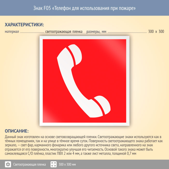 Знак F05 «Телефон для использования при пожаре (в том числе телефон прямой связи с пожарной охраной)» (светоотражающая пленка, 300х300 мм) в Кызыле купить