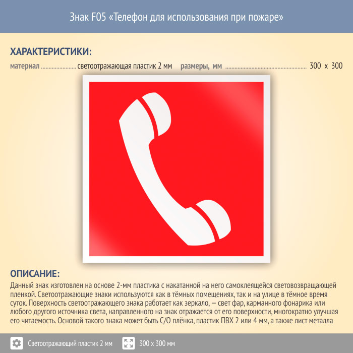 Знак F05 «Телефон для использования при пожаре (в том числе телефон прямой связи с пожарной охраной)» (светоотражающий пластик, 300х300 мм) в Кызыле купить